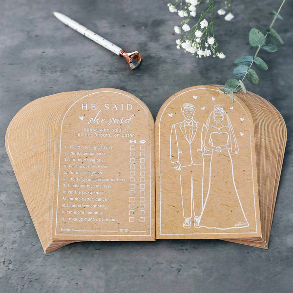 Make your bridal shower or engagement party unforgettable with the classic “He Said She Said” wedding game. These arch-shaped advice and game cards feature a charming faux kraft paper look with a sweet bride and groom illustration on the front and the interactive game on the back. Guests guess who said each statement, Bride, Groom, or Both, making it a guaranteed crowd-pleaser for all ages.