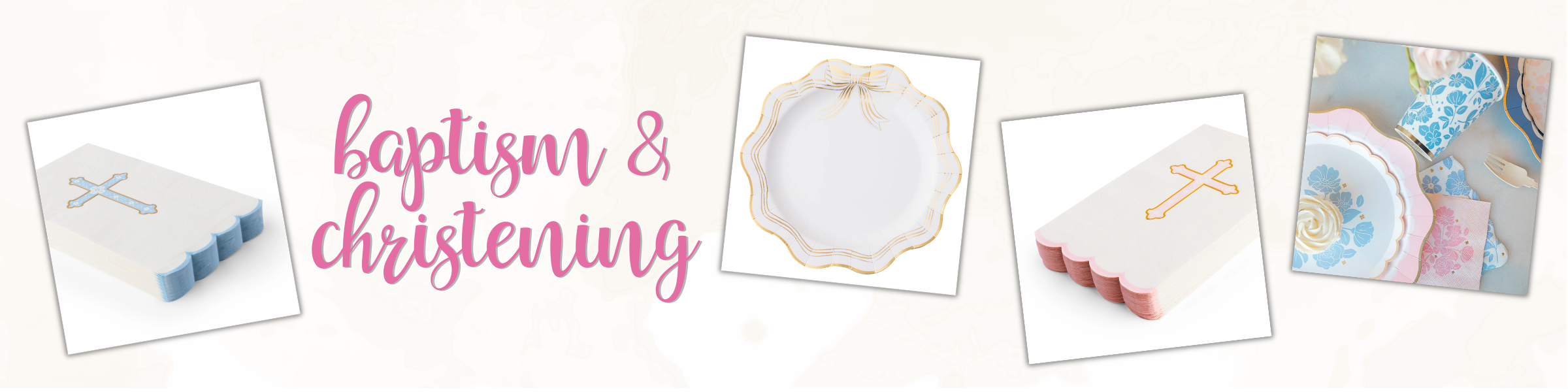 Celebrate a meaningful milestone with our Baptism and Christening Collection. Designed for baby baptisms, christenings, and dedication celebrations, this collection features elegant plates, napkins, cups, and décor in soft, timeless styles.
