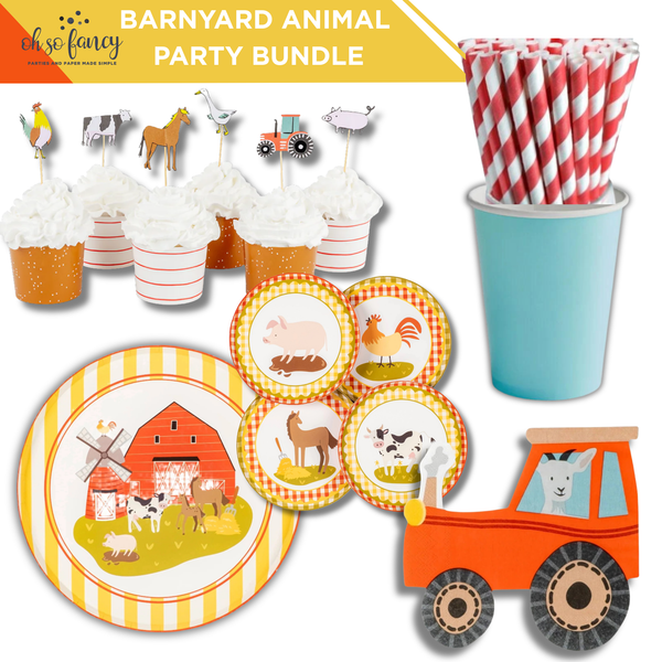 Celebrate your little farmer in the sweetest way with our Barnyard Animal Party Bundle featuring a full coordinating cupcake kit. This curated set brings together cheerful farm animals, classic red barn details, gingham accents, and playful tractor touches to make party styling simple and stress-free.